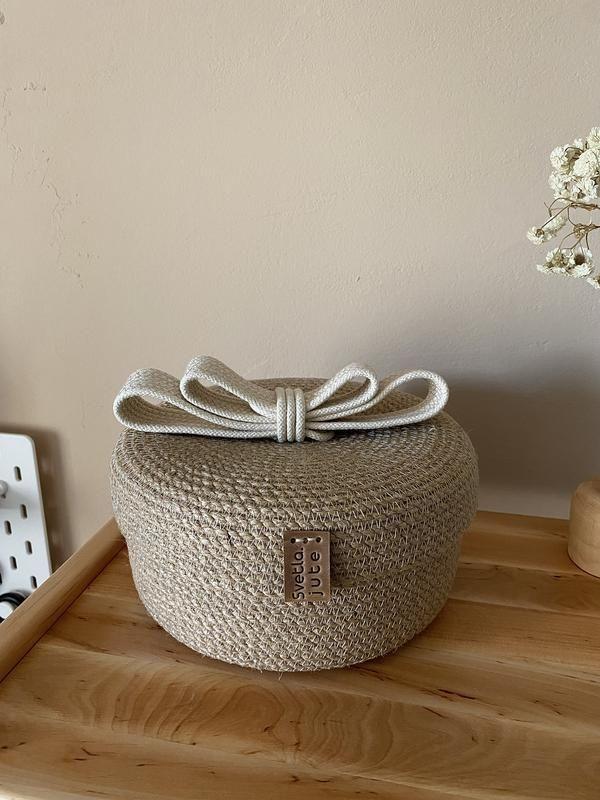 Корзина с крышкой из джута ручной работы отличная идея как подарочной упаковки так и как отдельный подарок. Материалы: джутовый канат, хлопковая веревка Размеры: диаметр 20см, высота 10см Создан с мыслью о природе. Отправлю НП/Укрпочтой