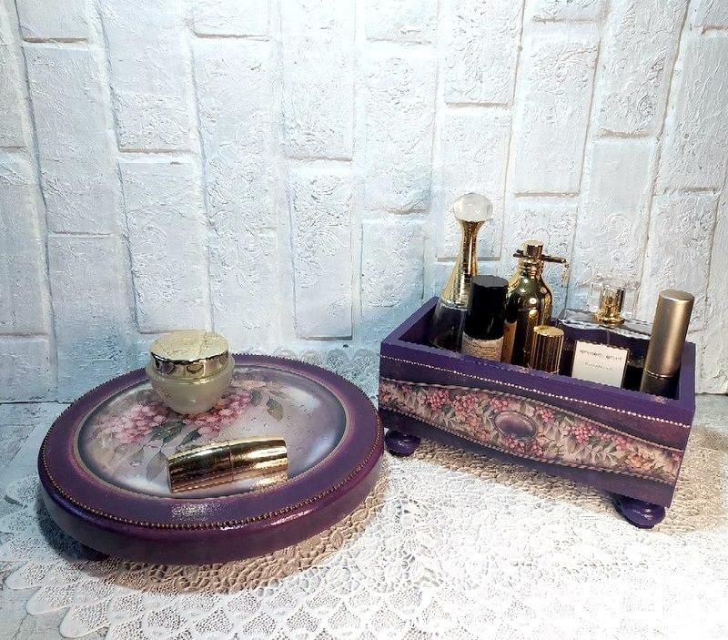 Фіолетовий набір складається з 3 предметів, міні піднос, короб та закладка для книги. Дуже гарний будуарний набір прикрасить будь-який туалетний столик, на ньому можна зберігати косметику, прикраси, жіночі дрібниці. Набір є функціональним, його можна використовувати для сервірування столу до чаювання. На міні-столику можна подати солодощі, а в коробці цукерки або горіхи. Такий набір стане унікальним подарунком для мами, дружини, сестри чи колеги. Розмір: стояк діаметр 23 см, короб 22 * 12 * 8 см