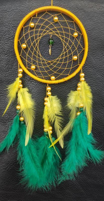 Ловец снов в желтых и зеленых тонах. Будет ярким дополнением к детской комнате на любой праздник. Материалы: деревянная основа, нитки ирис, бусины (акрил, стекло, агат), подвеска под золото в виде перьев, фурнитура, перьев (гуска и петух). Диаметр основания 12.5 см, длина ловца без шлевки, за которую вешать 33 см.