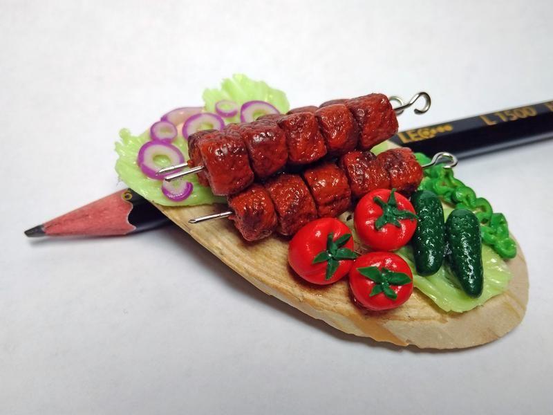 Миниатюрная доска в виде магнита "Шашлык". Размер магнита 6 *4 см. Основа из дерева, декор из полимерной глины, фурнитуры. Повтор может незначительно отличаться деталями! Возможно выполнение по вашим идеям! Товар под заказ