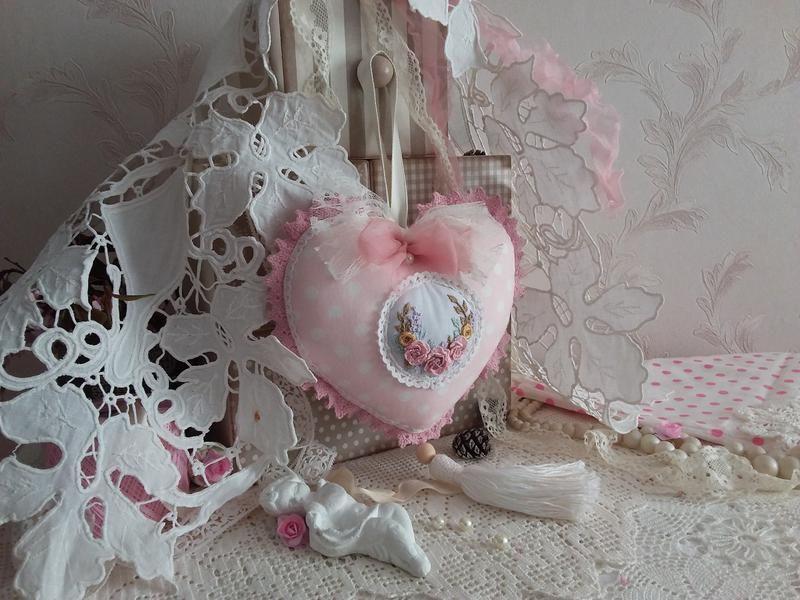 Представляю вам прелестное нежное сердечко. Украшено объемной вышивкой, кружевом, биссером. Довольно большое, 19 х 17 см. Отлично подойдет как для оформления детской, так и для украшения интерьера в стиле бохо, винтаж и др. Можно украсить швейную мастерскую и использовать как большую игольницу. При желании в комплект под общий стиль можно приобрести и дополнить вешалочкой и лошадкой-качалкой в технике декупаж. Вместе этот комплект смотрится гармонично, в единой тональности, все предметы эффектно дополнят компанию друг другу.