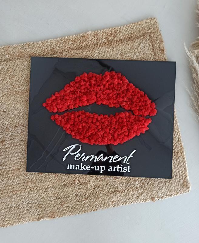 Новинка. Оригинальный декор и логотип одновременно в салон красоты. Красные губы выполнены из стабилизированного мха. Основа - фанера и черный Глянцевый полистирол поверх нее. Есть крепление чтобы повесить, или по Вашему желанию на двусторонний скотч. Надпись - это название вашего салона, студии, имя мастера, и др. Можно и без надписи сделать только губы разместить ниже. Размеры на фото 60*49 см. Заказать можно другие, стоимость при этом обсуждается. Стоимость в данном размере - 1600 грн