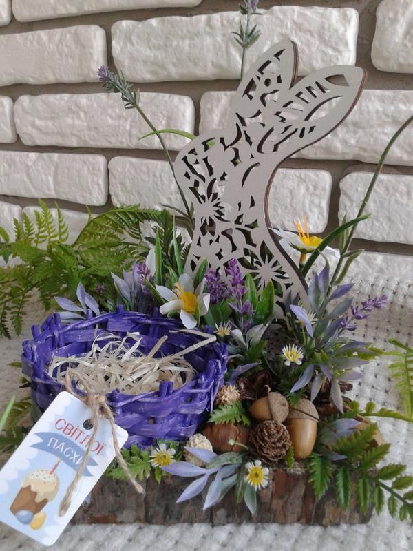 Интерьерная композиция ручной работы на декоративной основе сделана из натуральных природных материалов (сосновые шишки, желуди, скорлупа орехов, шишки казуарина, лиственницы, мешковина, древесная шерсть, лоза, коробочка лотоса) и искусственных цветов, зелени. Вся композиция напоминает солнечную лесную полянку. На ней расположился очень красивый ажурный зайчик с лукошком, в которое можно положить пасхальные крашенки (помещается 4-5 средних яйца) или небольшую пасочку. Смотрится очень симпатично и необычно. Яркие весенние цвета . Основа-пенополистирол. Длина - 18-19см, ширина-15-16см, высота по верхней точке-25-26см. Эта композиция украсит Ваш дом в светлый праздник Пасхи! Сделано с любовью и хорошим настроением :)! Оплата-100% на карту Приватбанка или наложенный платеж (передоплата 150грн.) Доставка за счет получателя Новой Почтой или самовывоз, возврата нет. Единственный экземпляр! Вес-497г