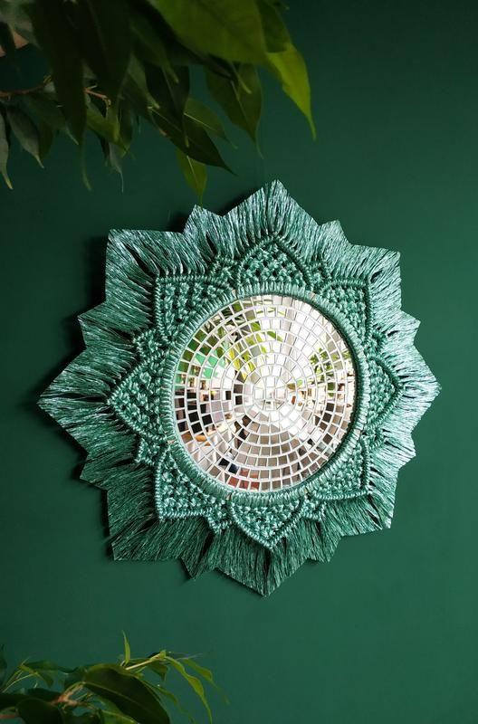 Макраме в виде солнца, с зеркальной мозаикой. Сделано вручную и с большой любовью! Макраме в форме солнца изготовлено из 60% хлопка и 40% люрекса, зеркальной мозаики и дерева. Форма солнца плетется вручную. Лучи макраме на солнце покрыты специальным лаком для поддержания идеальной формы, именно переплетение может гнуться, поэтому его всегда можно выровнять. С обратной стороны зеркала есть крепление, чтобы его можно было легко прикрепить к стене. Доступен в трех цветах: золотом, серебряном и бирюзовом. Мозаика наклеена вручную, для обработки использовалась пробка. Зеркала будет отлично подойдут для гостиной, спальни, прихожей и украсят любой интерьер дома. Это современное настенное зеркало станет прекрасным украшением любого уголка вашей спальни или дома. Каждое изделие создано мной вручную, что делает его уникальным. Поэтому каждый из них может немного отличаться. РАЗМЕР : Длина 45,5 см. Высота 45,5 см Толщина 1,5 см