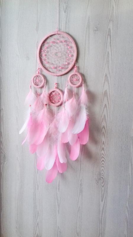 Большой розовый ловец снов. Использованы два вида бусин, и два вида перьев - белые и розовые. Размер центральной основы 20 см. Длина - до 50 см