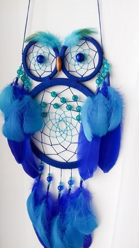 Большой ловец снов в форме совы синего цвета , с аквамариновыми бусинами и перьями. Диаметр центральной основы 16 см, длина - 48 см Товар под заказ