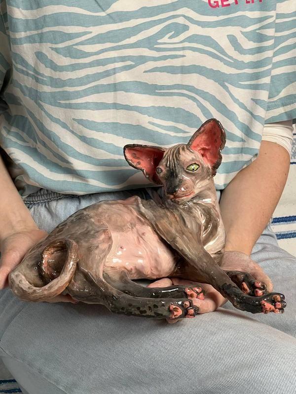 Керамическая киса, созданная с вдохновением лысими кошками. Вес до 1кг, длина 30 см, ширина 15 см. Выполняет функцию декорации, и созерцания. Выполнена из 76 глиной, ангобы, полива.