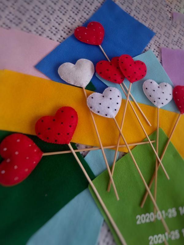 Валентинки з фетру. Розшиті бісером, наповнювач холофайбер, шпажка бамбук. Підійдуть як доповнення до подарунку або окремий сувенір (в школи, садочки, офіси). Розмір сердечка 6х4.5 см Висота 21 см Кількість - за Вашим бажанням) Ціна вказана за 1 штуку.