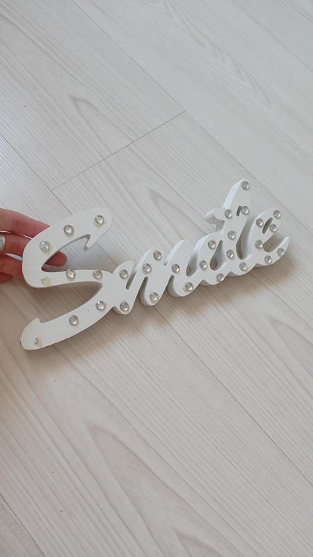Надпись Smile Декоративный. Древесный. Цвет белый со стразами. Размер 10*28 см. Имеет недостатки/см фото.