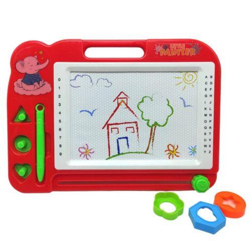 Яркая пластиковая доска для рисования с магнитной основой, выполненная в виде домика. Сбоку изображены буквы английского алфавита. В наборе есть магнитная ручка, 3 трафарета и 3 печатки. Доска с удобной ручкой. Готовый рисунок можно стереть, потянув за бегунок внизу доски. Размер доски - 27х20х2 см, поля для рисования - 16х11 см. Для детей от 3-х лет.