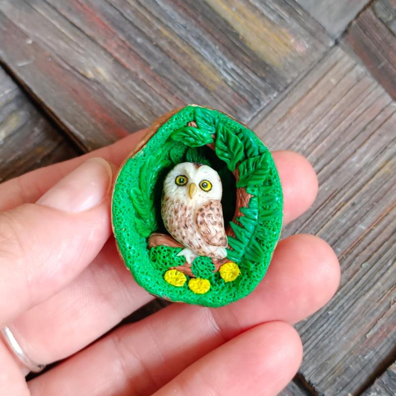 Миниатюрная сова, ручной работы, из полимерной глины в скорлупе греческого ореха,