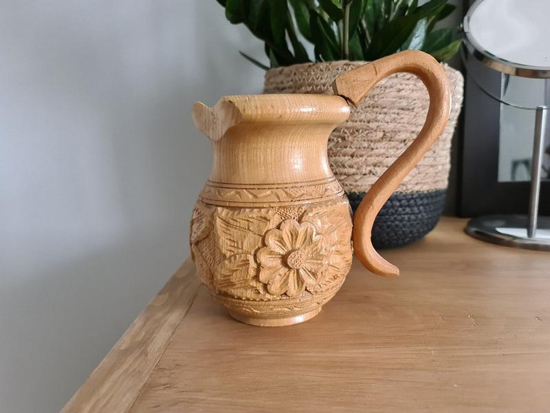кувшин из натурального дерева, привезенный из европы. высота 15 см, с ручкой 18 см.