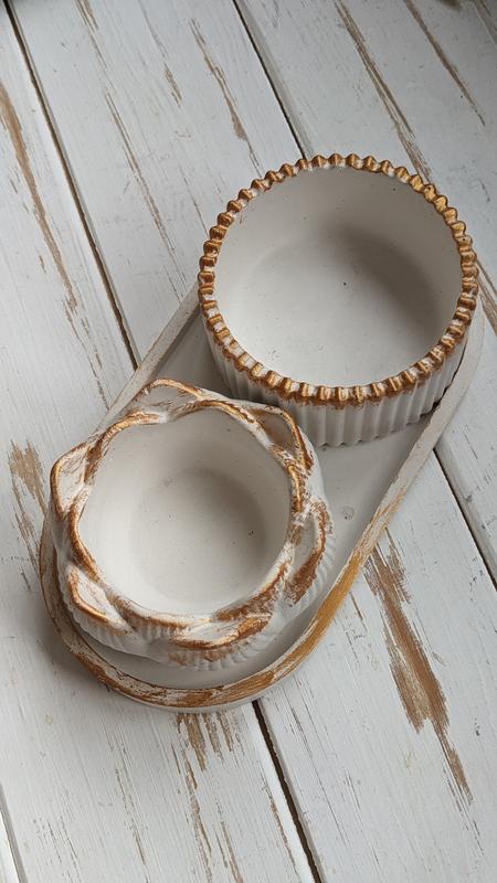 Красивой и нежный гипсовый декор. Подойдет в качестве подсвечника, подставки для мелочей, декор для фотосессий. Набор из 3 элементов. Также возможны другие варианты исполнения.
