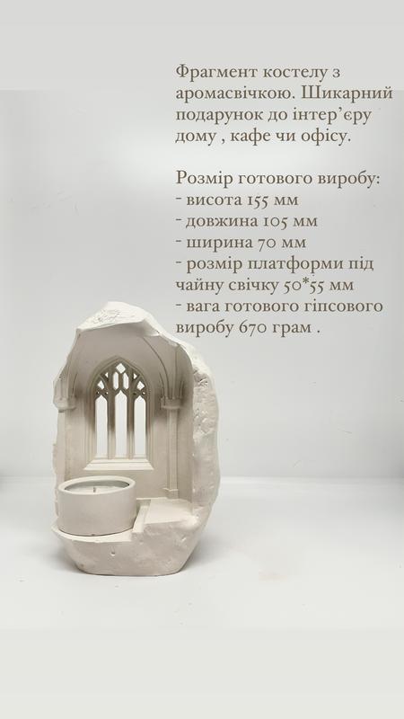 Фрагмент костела с аромасвечиной. Шикарный подарок в интерьер дома, кафе или офиса. Размер готового изделия: - высота 155 мм - длина 105 мм - ширина 70 мм - размер платформы под чайную свечу 50*55 мм - вес готового гипсового изделия 670 грамм.
