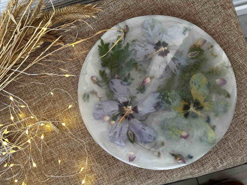 Поднос ручной работы. Диаметр 21,5см, толщина 2см. Поднос имеет покрытие с пищевым допуском, что позволяет подорвать на нем торты. На нижней стороне имеются 4 деревянные ножки. Он украсит любой интерьер, создают атмосферу достойную Пинтереста.