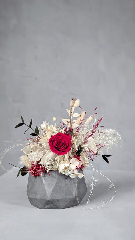 Композиция из сухоцветов и стабилизированных цветов в бетонном кашпо