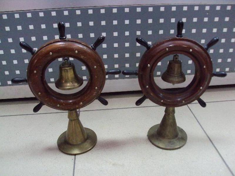 Сувенир морской штурвал с колокольчиком рындой дерево латунь высота 27 см лот 2 шт №11367