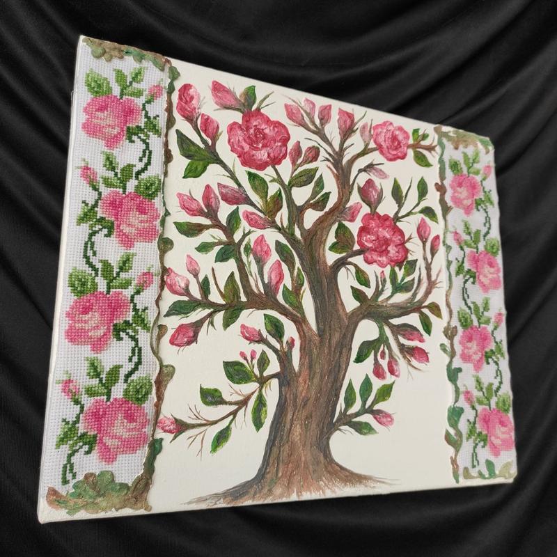 Оригинальная картина, сочетающая традиционные мотивы с современным искусством. Изысканное текстурное дерево, которое дополнено декоративными элементами в виде вышитых лент с цветочными орнаментами. Идеально подойдет для декора интерьера и станет отличным подарком. Размер - 20x30