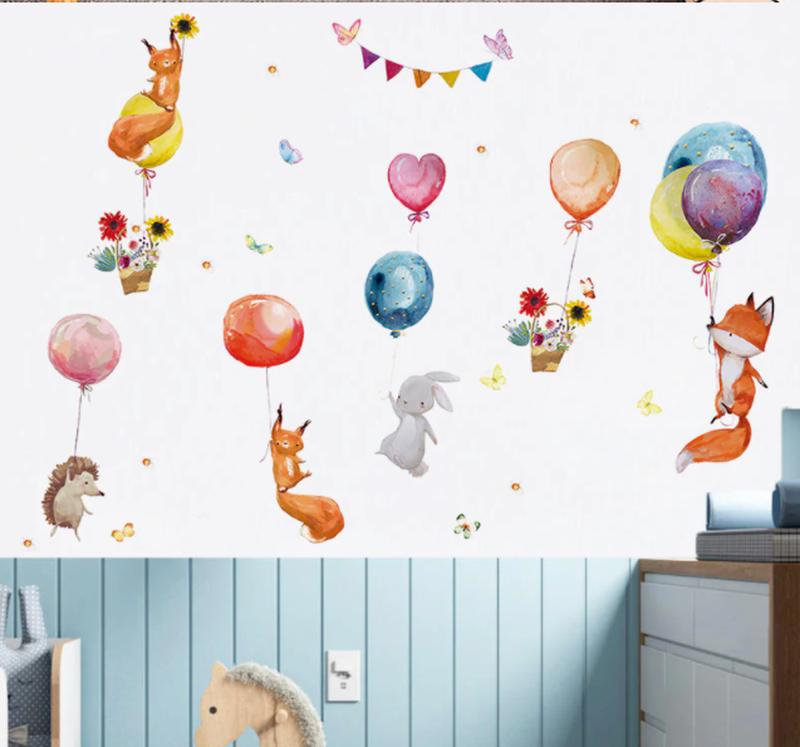 Размеры на 2-м фото Наклейка на стену, наклейка в детскую "зверята на воздушных шариках! Animal Balloon: белочки, зайка, ежик, лисичка на на воздушных шариках Приблизительный размер после наклеивания 110см*107см", смотрите на фото, каждый элемент, зверек клеится по-отдельности! Вы получите наклейки, которые компактно наклеены на листе размером 60см*90см