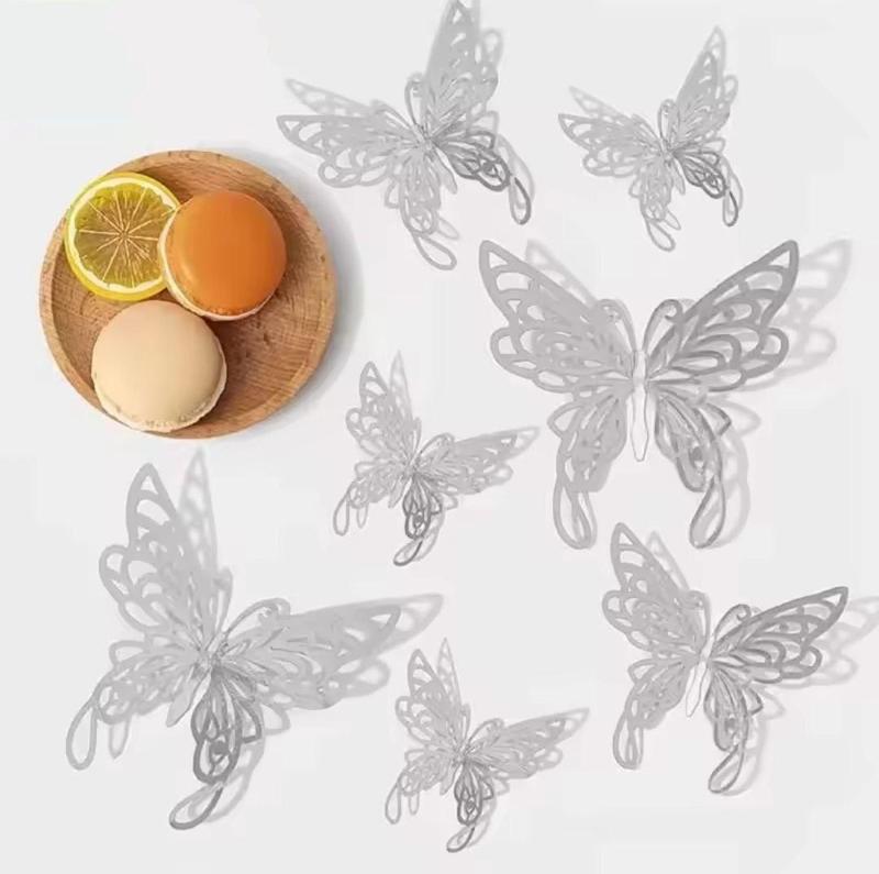 3D наклейки бабочки серебро 12штук набор JJ319-E Размеры: 12см 4шт 10см 4шт 8см 4шт