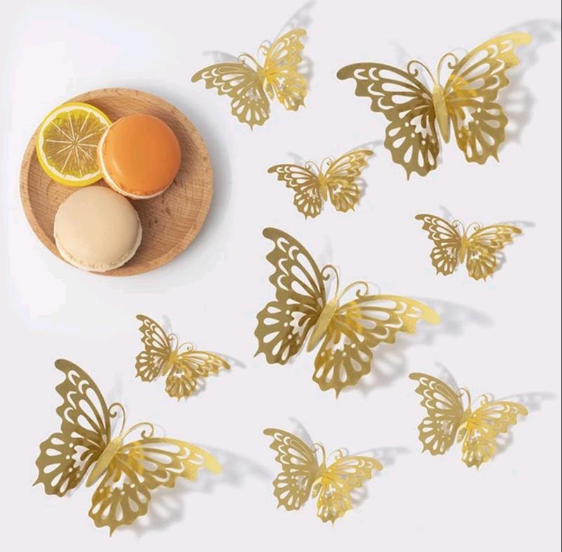 3D зеркальные наклейки бабочки золотые 12штук набор JJ313-E Размеры: 12см 4шт 10см 4шт 8см 1шт