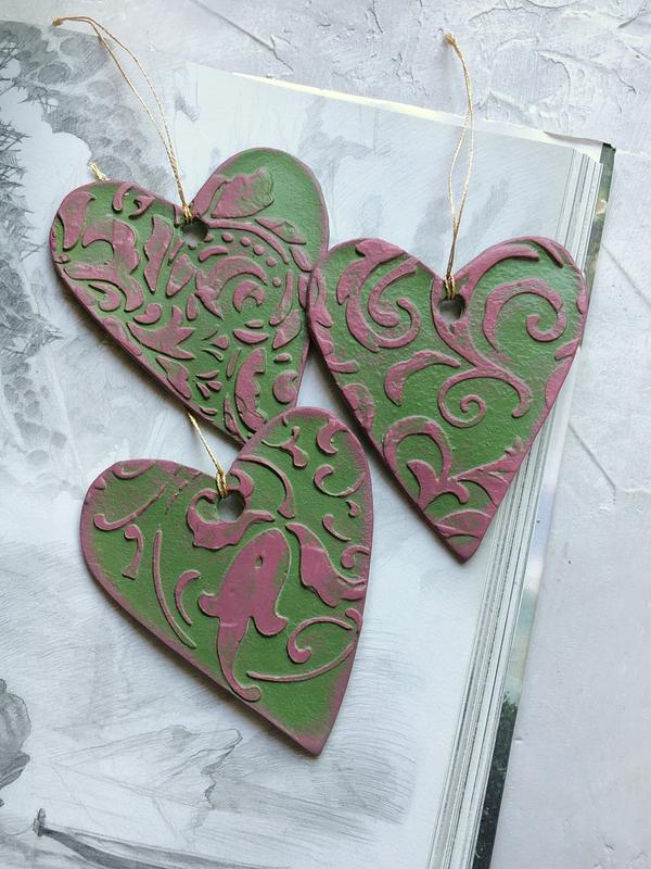 Интерьерные украшения в форме сердечек созданы вручную из бельгийской полимерной массы Darwi rock. Винтажный стиль. Декорированы акриловыми красками и французским воском Либерон. Размер 8,5х6,5 см. В наборе 3 шт.