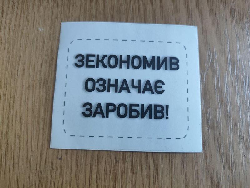 Надпис - ЗЕКОНОМИВ ОЗНАЧАЄ ЗАРОБИВ! цвет текста - черный На белом фоне Размер - 8х9 см Вид - наклейка