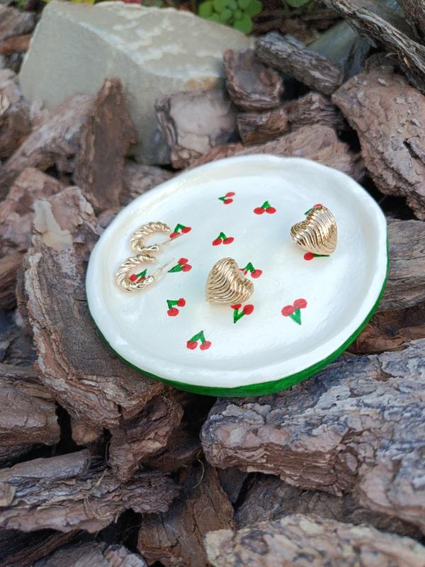 Очень милая тарелка с вишнями) Изготовлена из глины. Подходит для декора, или хранения украшений. Размеры диаметра 11 см, высота 1.2 см.