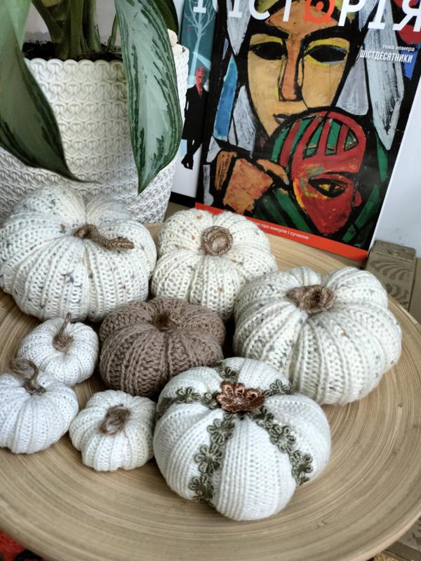 Гарбузи та жолуді текстильні, в'язані, оксамитові для декору інтер'єру або для гри дітям.