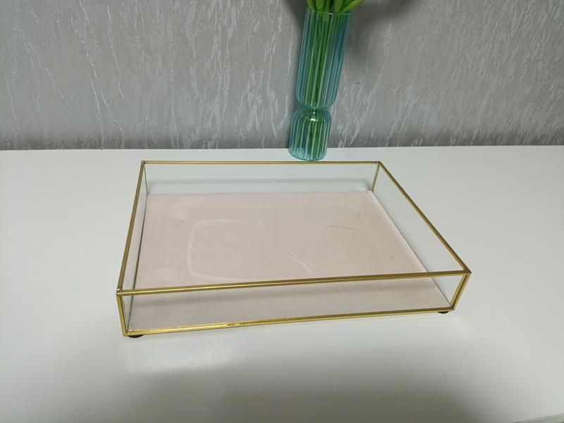 Подставка декоративная стеклянная с золотистой оконнтовкой, но стояла на витрине и есть некоторые вмятости на велюровой подложке (на дне).Размеры длина - 25см. Ширина - 18см. Высота - 4,5 см.