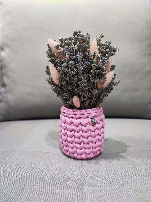 Композиція з лаванди та сухоцвітів у в'язаному кошику. У складі букета: лаванда та лагурус. Усі сухоцвіти натуральні, при цьому ніколи не зав'януть та будуть радувати довні роки. Кошик зв'язаний з трикотажної пряжі. Висота композиції - 20 см.
