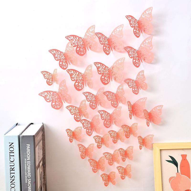 Бабочки для декора. Цвет: персиковый. Материал: бумага. Количество: 12 штук. Размер: 4 штуки 12 на 8 см. 4 штуки 10 на 6 см. 4 штуки 8 на 5 см. В набор входит 2-х сторонний скотч.