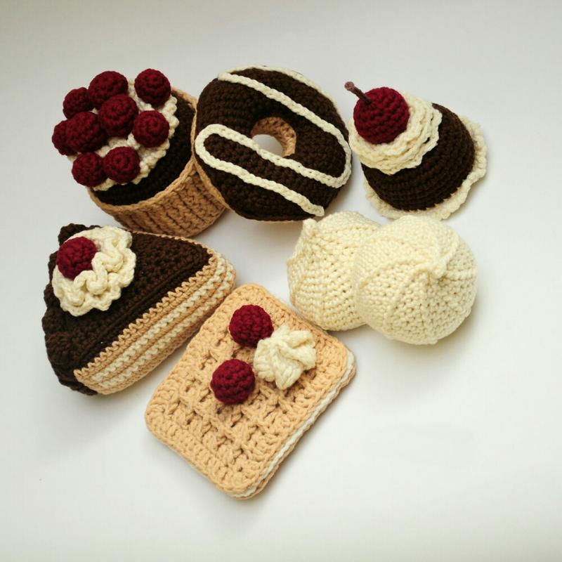 Вязаные сладости для декора, интерьера, фото. В набор входит: - кусочек торта 1 шт, - капкейк с вишнями 1 шт, - пирожное вишня с хвостиком 1 шт, - зефир 2 шт, - вафли 1 шт, - пончик - 1 шт. Кухлик и тарелка в набор не входит. Размеры приближены к реальным. Гипоаллергенные материалы Без клея! Возвращение нет.