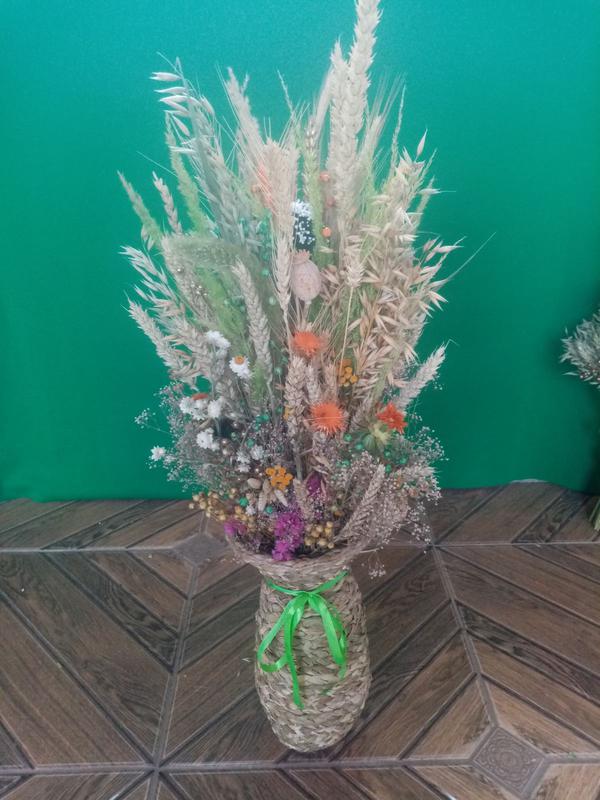 Ручна робота!!! Висота 72 см. Відправка: Новою поштою!! В одному екземплярі !!! Також можна використовувати як декор для дому. Дідух — це останній обжинковий сніп. Овес, жито, пшениця, льон - його основні складові. Солом'яний оберіг — це дух предків, дідів, збереження традицій і пам'яті родини. Це символ доброго врожаю, миру й злагоди в родині, достатку в домі. Традиція ставити в оселі на покуті дідуха походить ще з дуже давніх часів. У дохристиянських віруваннях він був утіленням бога Коляди, символом пам'яті про предків. Святковий сніп перебував у хаті протягом тижня (подекуди навіть до Водохреща). Його присутність привносила в родину святковий настрій, затишок і святковість. У народі казали «Дідух до хати – біда із хати». Дідухи в звичаєво-фолькльорній палітрі різдвяно-водохресного циклу свят можуть різнитися за місцевим колоритом, мати свої типологічні риси, що зумовлено впливом християнської традиції, зміщенням у календарі, затемненням чи втратою внутрішньої форми звичаїв та обрядів, змінами в традиційному способі життя. Навесні, на Комоїдицю (свято пробудження весни) дідуха спалювали, обов'язково до зорі, на знак закінчення зими. Спалення дідуха також символізувало, що душам померлих вже час повертатися на небо. Тліючими вуглинками від дідуха хлопчикам 12—13 років підсмалювали кінчик пучка волосся, «щоб не боявся нічого в цьому житті» — це вважалося першим посвяченням у парубки. Попіл від дідуха вважають помічним від хвороб як людей, так і тварин. Його зберігають рік за іконами. Існують триногі, п'ятиногі дідухи. Плетуть із жита чи пшениці; де їх було обмаль, могли використати овес. Прикрашали дідуха волошками, калиною, стрічками, паперовими чи засушеними квітами.