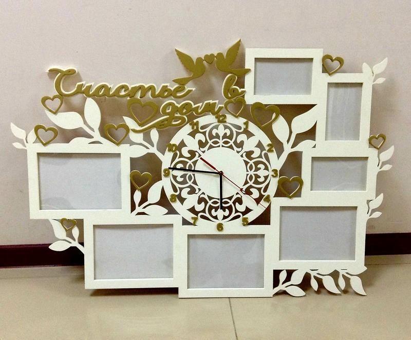 Фоторамка+часы "Счастье в дом" Размер общий 85х60 см Размеры рамок 8х13- 3 шт , и 13х18 см- 5 шт Любая фото рамка побалует вас своей красотой , а особенно 2 в 1 , рамка + часы. Новинка от StudioN Цвет на фото коричневая морилка , и золотой декор. Вы можете выбрать свою цветовую палитру! Материал: дерево; Сроки изготовления: до 5 рабочих дней (обсуждается индивидуально); в комплекте: защита для фото, задники и крепление на стену; Возможно внести любые изменения по дизайну, размеру и цвету, работаем по индивидуальному заказу. Самым дорогим на свете людям, в подарок. Фото рамочка из дерева вырезана лазером, с большим размером фоторамок, гармонично впишется в ваш интерьер. К рамкам идут подложки с изнаночной стороны изделия, закреплены на анкерах,(в любой момент можно поменять фото в рамке)и все получается аккуратно и стильно.Такая рамка будет украшением вашего дома или отличным подарком.Яркая , красочная с изюминкой...в нее вложена любовь и мастерство дизайнера. Товар под заказ