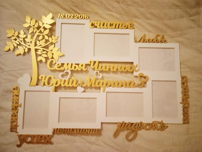 Фоторамка фамильная с деревцем и словами 76х55 см на 7 фото. Общий размер 76х55 см, фоторамки 10Х15 СМ - 7 шт. Макет с вашей уже фамилией предоставляю, по цветам обсуждаем варианты. Новинка от StuduoN материал дерево (фанера 6 мм) Фоторамка изготовлена способом лазерной резки.Покраска коричневая морилка+декор. Это может быть и подарок и дар другу и семейное древо. В интерьере дома будет смотреться здорово.Рамки для фото идут без стекла,а с легкой пленкой пэт для фото ,рамка получается легкой,в чем и ценность таких изделий.К рамкам идут подложки из картона с изнаночной стороны изделия на анкерах. Есть много вариантов как оформить ваш дом или квартиру стильно и со вкусом, так что каждая стена и каждый уголок выразит вашу индивидуальность. Просто забудьте о пустых стенах! Они ничего не говорят, тихо и пусто. Украсьте стены фотографиями и украсьте ими стены в разных комнатах вашего дома. Это, конечно, творческий смелый вариант — показать свои лучшие воспоминания, увековеченные на фотографиях. Мастерски оформленная фотокомпозиция быстро притягивает взгляды и бессловесно рассказывает целые Семейные истории... Деревянная рамка - отменный подарок родным и друзьям, и в свою семью украшение уголка любви. Она создана с любовью и нежностью. Цвет можно сделать по вашему желанию., подходящий к вашему интерьеру. Фото рамка– это и архив, и декор одновременно. А ещё это отличный подарок И память о минувших событиях и дорогих людях Товар под заказ