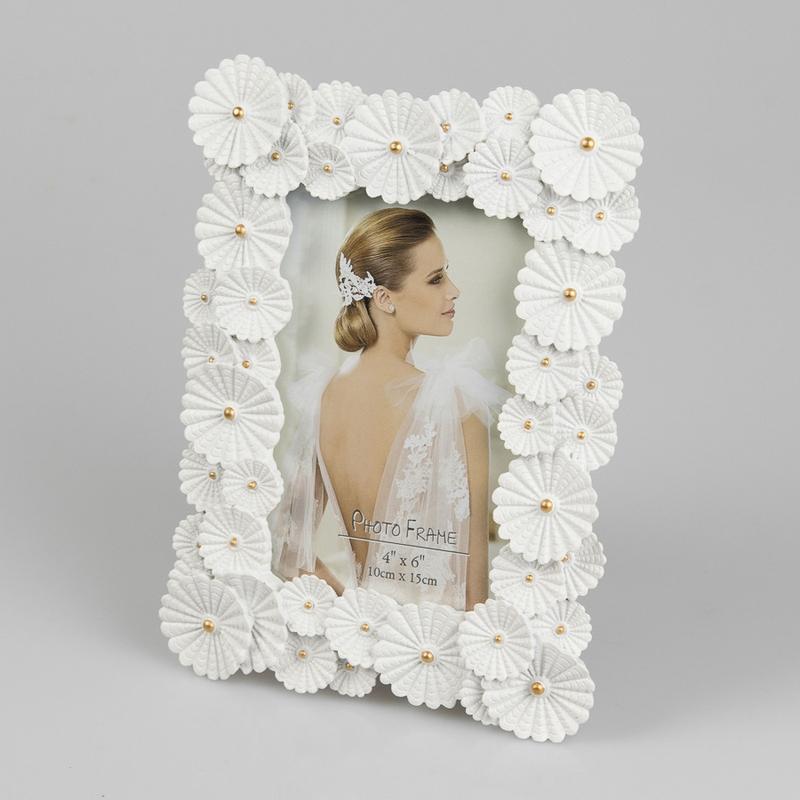 Фоторамка Veronese Цветы 16х21 см 1035CM Элегантная фоторамка объёмными белыми цветами с золотой бусинкой по центру, наилучшим образом украсят любимое фото. Такая фоторамка именно то, что нужно для достойного обрамления свадебных фото. Влюбленные взгляды счастливой пары, красивое белое платье невесты, первый трепетный танец молодой семьи. Но также она станет прекрасным дополнением фото семьи, дочки, бабушки, подруги. Такая фоторамка очень стильная, поэтому станет прекрасным дополнением интерьера. Подчеркнет индивидуальность вашего дома.