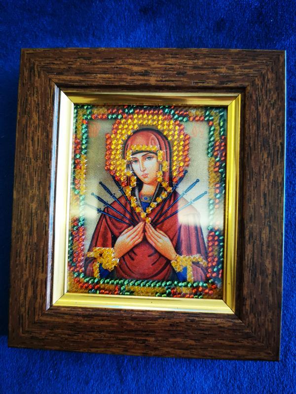 Икона вышита с качественного чешского бисера. Рамка сделана под заказ. Удобный небольшой размер, который можно носить в сумке, взять на работу, поставить на рабочий стол размер 9,5 на 11 см Семистрельная икона от чего защищает, и в чем помогает: Богородица призывает к терпению, смирению, поэтому избавляет людей от раздражительности, гнева, злости, враждебности, злых намерений и мыслей, желания отомстить кому-то или пожелать чего-то плохого.