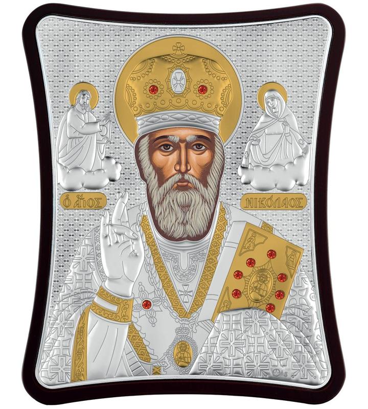 Оклад образа изготовлен из листа Miro-Silvero (итальянского производства); нижнее основание материала - алюминиевый отражаемый металл ALADO который сверху ламинирован серебром 999 пробы тонким слоем. Серебро покрыто защитным оксидным лаком, сохраняющим материал от потемнения и внешних раздражителей. Отдельные части иконы украшены сусальным золотом. Все элементы сюжета иконы до мельчайших деталей и узоров четко вырезаны на окладе, вместе создают гармоничную яркую картину. Закреплен оклад в деревянном киоте (основе) формы четырехугольной звезды, изготовленной из МДФ покрытого шпоном дерева. Сзади икона есть откидная ножка и отверстие для крепления на стене. Цвет дерева: коричневый (орехова текстура). Лик иконы прописан на холсте натуральными красками "Темпера" с помощью метода шелкографии. Образ упакован в оригинальную картонную коробочку от производителя с логотипом компании, которая имеет отличный подарочный вид. Сзади на иконе есть закрепленный Сертификат качества, удостоверяющий оригинальность изделия. Производитель: Prince Silver Греция.
