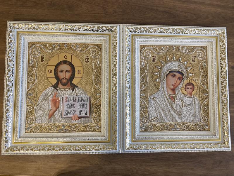 Продам иконы «Винчальная пара», выполненные в одном стиле для свадебного венчания. Ручная работа. Вышиты японским бисером MATSUNO, чешскими перламутровыми бисеринами Preciosa, хрустальным камнями Сваровских, по периметру обшиты чешским стеклярусом Preciosa. «Венчальная пара» — так называют иконописную композицию из двух икон:ордина и божественной Матери. Иконы станут хорошим украшением и оградой вашего дома, хорошим подарком для близкого человека. Размер с рамой: высота- 0,47см; ширина- 040см. Цена за пару 8000 грн.