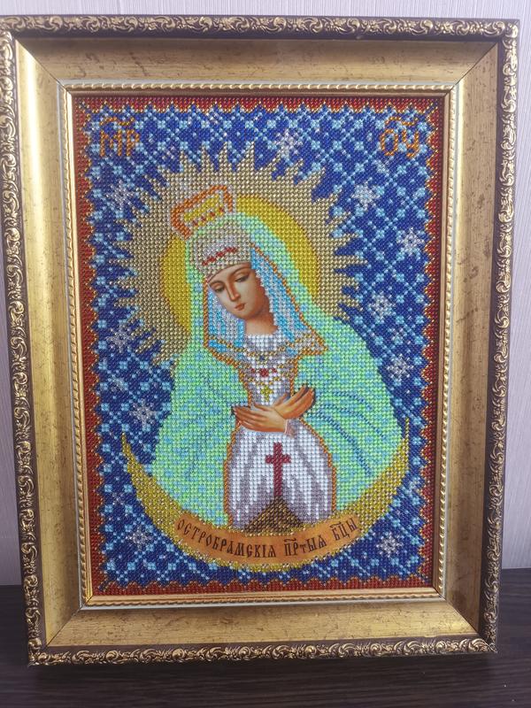 Ікона Остробрамська, вишита чешським бісером в рамці. Розмір ікони з рамкою 25х32. Рамка без скла. Сама вишивка натянута на поролон, тому малюнок наче трішечки випуклий. Та завдяки тому, що немає скла бісер виглядає дуже яскраво. Доставка Укр та Новою поштою.