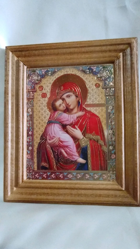 Кілька примірників у наявності Друк на структурованої холстовой папері з частковим фольгуванням зображення . Розмір 15х12,5 см , дерев'яна рамка шириною 2 см . Ціна за 1 ікону. Доставка Новою поштою або Укрпоштою за передоплатою на карту Приватбанку.