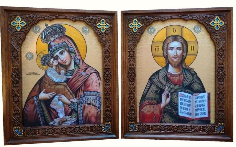 Предлагаю венчальные иконы ручной работы, на деревянной доске, с резьбой, тонированные и лакированные высококачественными материалами. Икона стилизованная под письмо с использованием художественных акриловых красок, текстурного геля, лака и акрилового золота. Срок изготовления от 3 до 7 дней. Цена 2700 грн. за пару. Размер 21х27см толщина 27мм. Товар под заказ