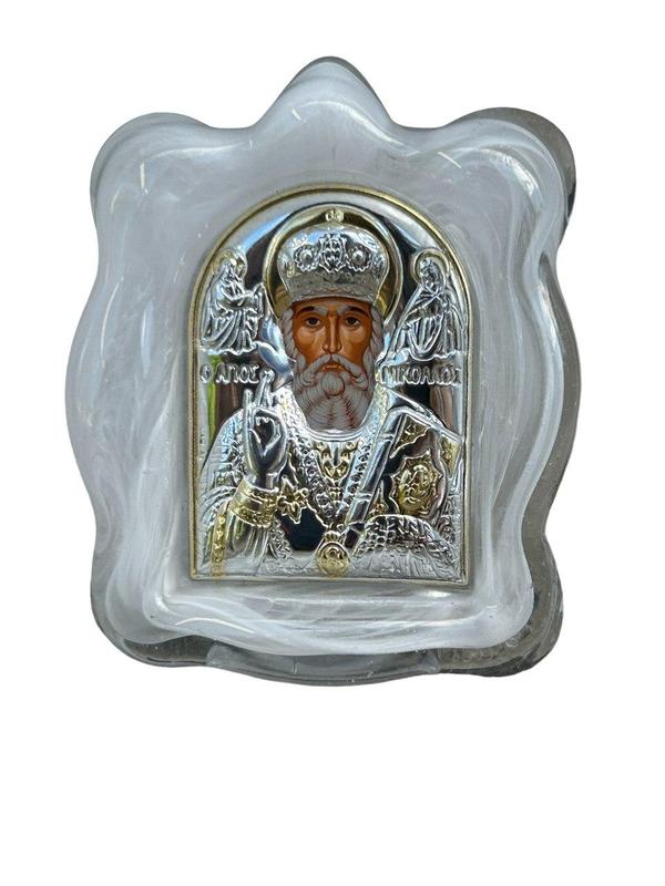 Ікона Свята Микола Чудотворець (мурано) Срібло 925 проба. Основа: Муранське скло Розміри 7х9 см ЕК1-009m