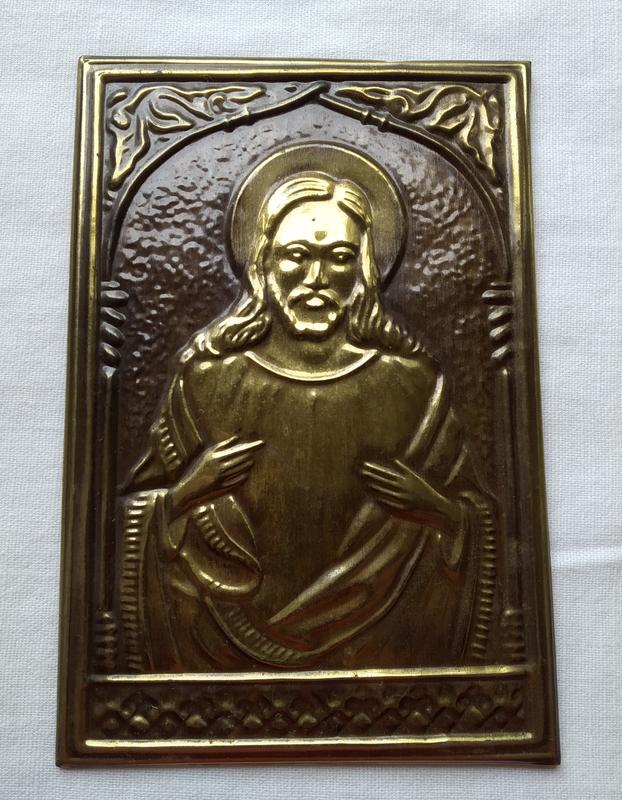 Винтажное панно плакетка, медная чеканка, иконка, Иисус Христос. Размеры 14х9см. Этикетка. Состояние по фото хорошее б. у.