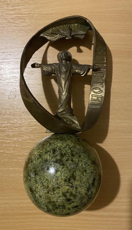Сувенір фігура Спасителя. Памʼятний знак «200 років від Різдва Христова». Схоже на бронзу Чи мідь. Фігура розміщена на натуральному камені «змійовик». Змійовик як талісман для спортсменів, юристів, бізнесменів. Висота 23 см.