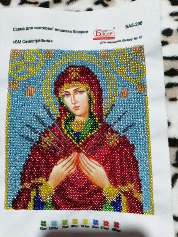 Икона "Семистрельная", вышитая чешским бисером, без рамки.Можна сделать с рамкой будет дороже.Замеры находятся на фото.