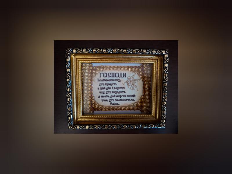 Икона "Моллитва в дом" Вышитая Чешским бисером, оформлена в современный багет под антибликовым стеклом Размер работы в раме: ширина 16см, высота 13см ревнователю сопровождает всю жизнь. Приятно иметь красивую вышитую достопримечательность с помощницей для домашнего использования. Эта вышивка может стать отличным подарком мужчинам к любому празднику.