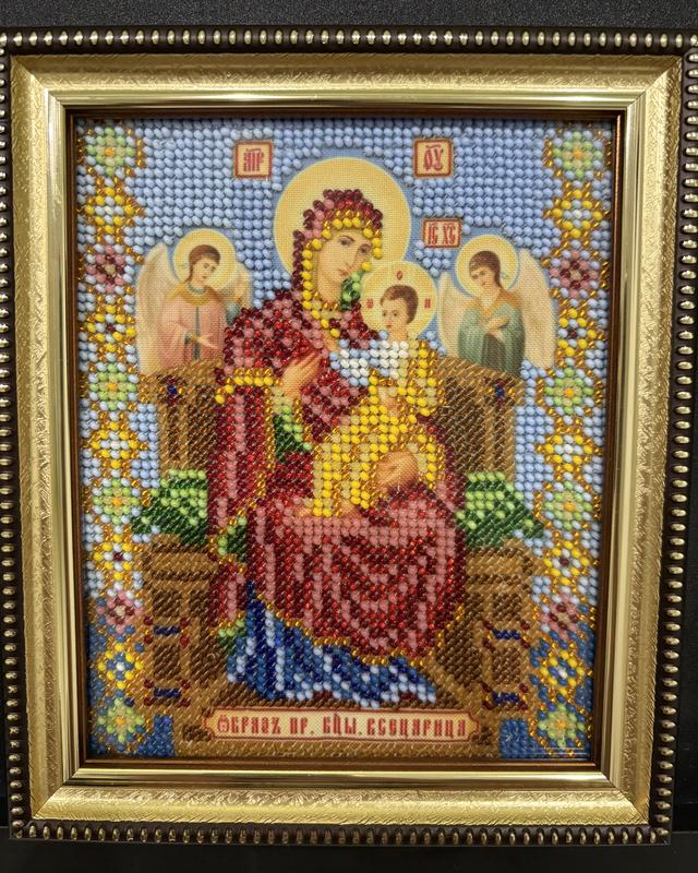 Ікона ручної роботи ю, вишита бісером, в деревяній рамці. Розмір - висота - 18см, ширина - 15см Ікона Святої мучениці Софії допомагає в багатьох сферах: вона оберігає сім'ю, зміцнює подружні стосунки, допомагає у вихованні дітей, дарує терпіння, мудрість і терпіння, захищає від спокус, хвороб і зла, а також сприяє народженню дітей і збереженню миру в домі.