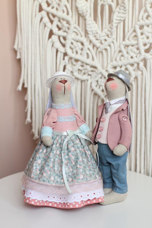 Закохана парочка зайцев виконані у вишуканих кольорах попелу троянди і бірюзи Стримані і стильні, вишукані і ніжні, благородні і трепетні Зайчики стануть прекрасним подарунком на весілля, річницю або заручини Привнесуть в інтер'єр відчуття літнього тепла і наповнять простір душевністю і любов'ю